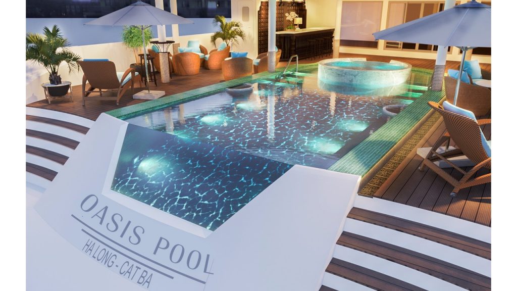 Sự sang trọng của du thuyền còn được thể hiện ở những cơ sở phục vụ giải trí của khách hàng như: bể bơi vô cực với diện tích 50 mét vuông kèm với đó là hệ thống cầu trượt nước giúp quý khách có những khoảnh khắc vui đùa – sảng khoái giữa không gian biển xanh mà chẳng du thuyền nào ở Việt Nam có thể mang lại, phòng tập Gym, Sauna Massage, rạp chiếu phim…. Giúp quý khách cảm nhận được một chuyến đi đầy “ sành điệu và hoành tráng ”.