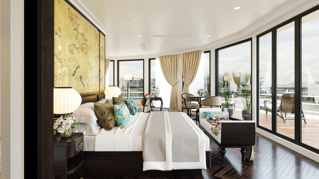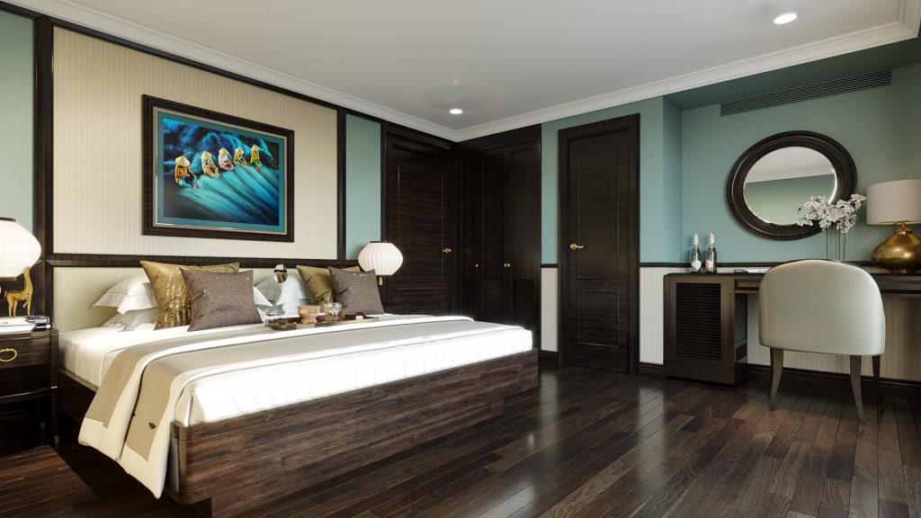 Tất cả các phòng được bố trí một cách đồng bộ, khoa học cùng với những trang thiết bị nội thất tạo quý khách cảm nhận về một không gian sang trọng – hiện đại nhằm đáp ứng cho những du khách khó tính nhất. Đặc biệt các phòng đều được bố trí với ban công riêng và cửa sổ kính lớn giúp quý khách tận hưởng từng khoảnh khắc trong ngày khi khám phá vẻ đẹp của Vịnh Lan Hạ….
