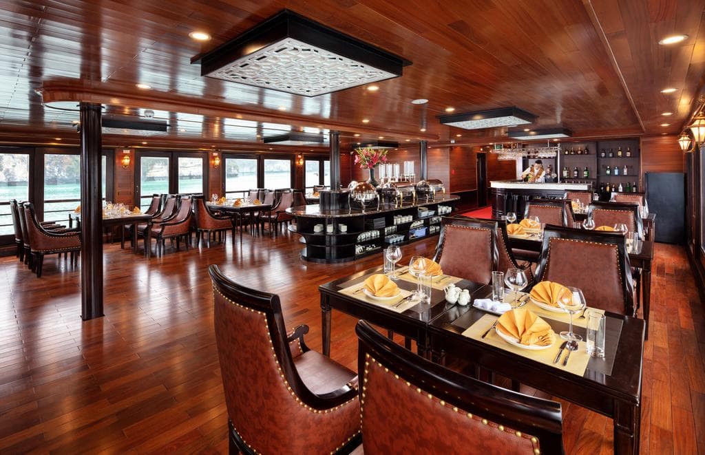 Nhà hàng của du thuyền V’Spirit Premier được phủ một màu sắc nâu trầm ấm, thanh lịch cùng với nội thất được bài trí gọn gàng, trang nhã, nổi tiếng với những món ăn Âu và những món truyền thống của Việt Nam. Ngồi tại bất cứ vị trí nào hành khách cũng có thể chiêm ngưỡng trọn vẹn cảnh đẹp biển và những núi đá vôi kỳ bí.